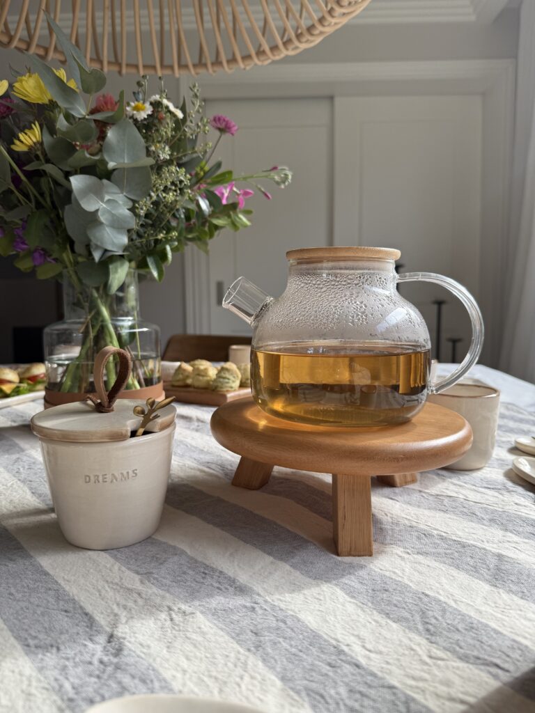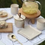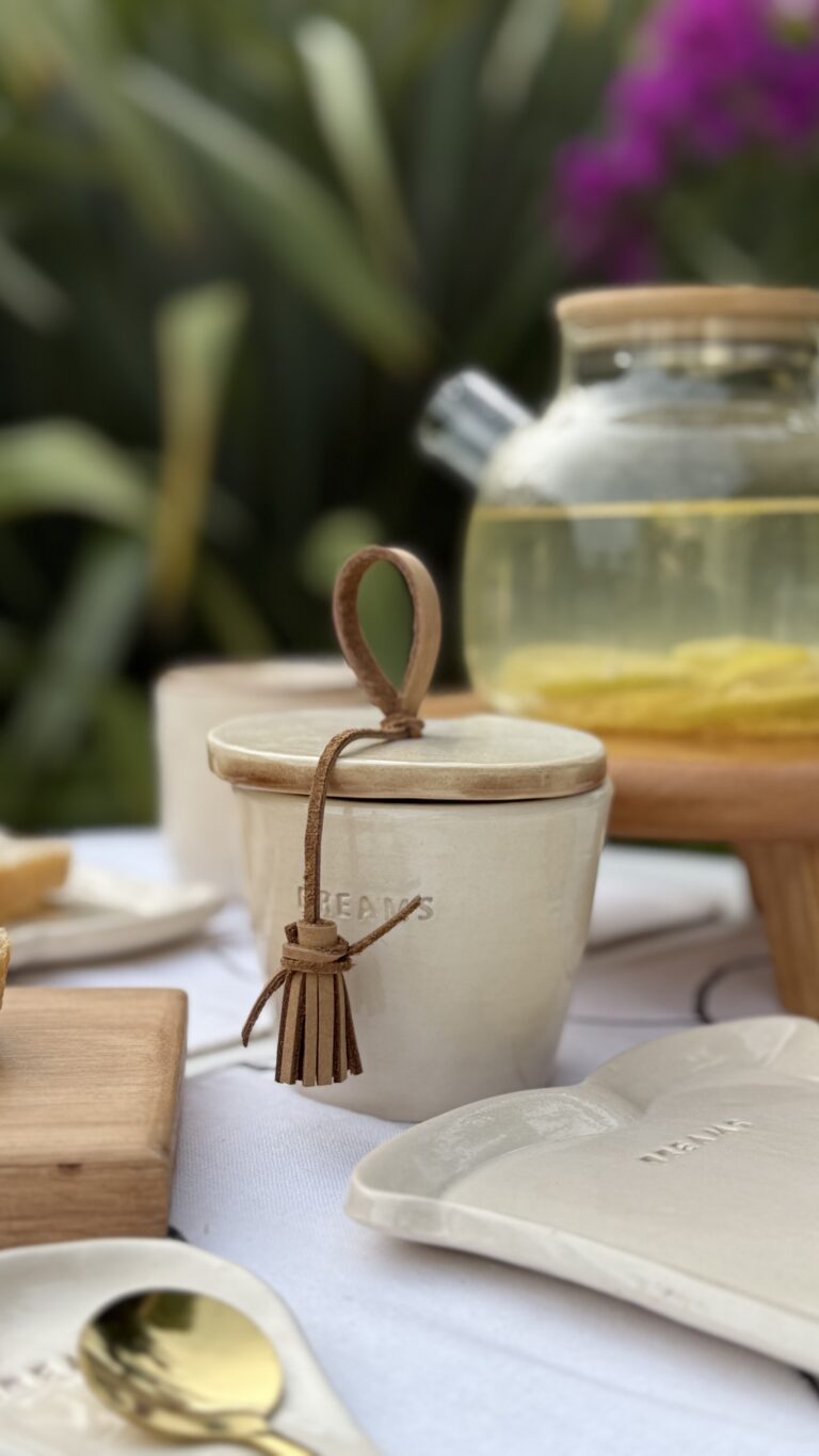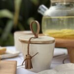 Esta azucarera hecha en cerámica a torno, está pensada para quedar sobre la mesada, acompañar el desayuno o sumarse a la bandeja del café con presencia propia. El detalle de la tapa con lazo de cuero le da el gesto justo: natural, funcional y estético.