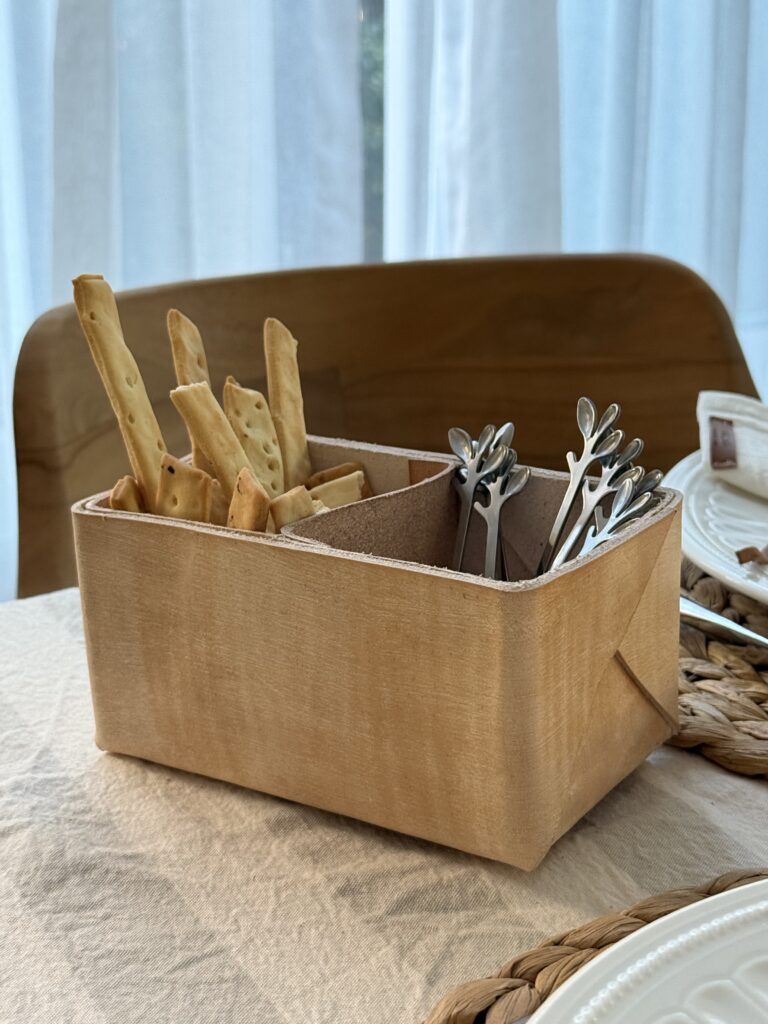 Hay objetos que organizan y, al mismo tiempo, decoran. Esta cajita de cuero natural con divisiones internas es uno de ellos. Hecha 100% en Uruguay, es una pieza noble y versátil que podés usar sobre la mesa, en una bandeja de desayuno, o como organizador en tu cocina o escritorio.