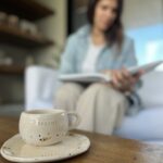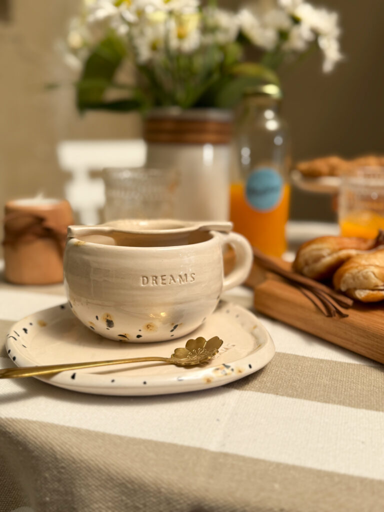 Set de taza de cerámica con plato. Todas nuestras piezas en cerámica son realizadas a mano y en torno alfarero. Piezas únicas. Esmaltes libres de plomo, no tóxico.