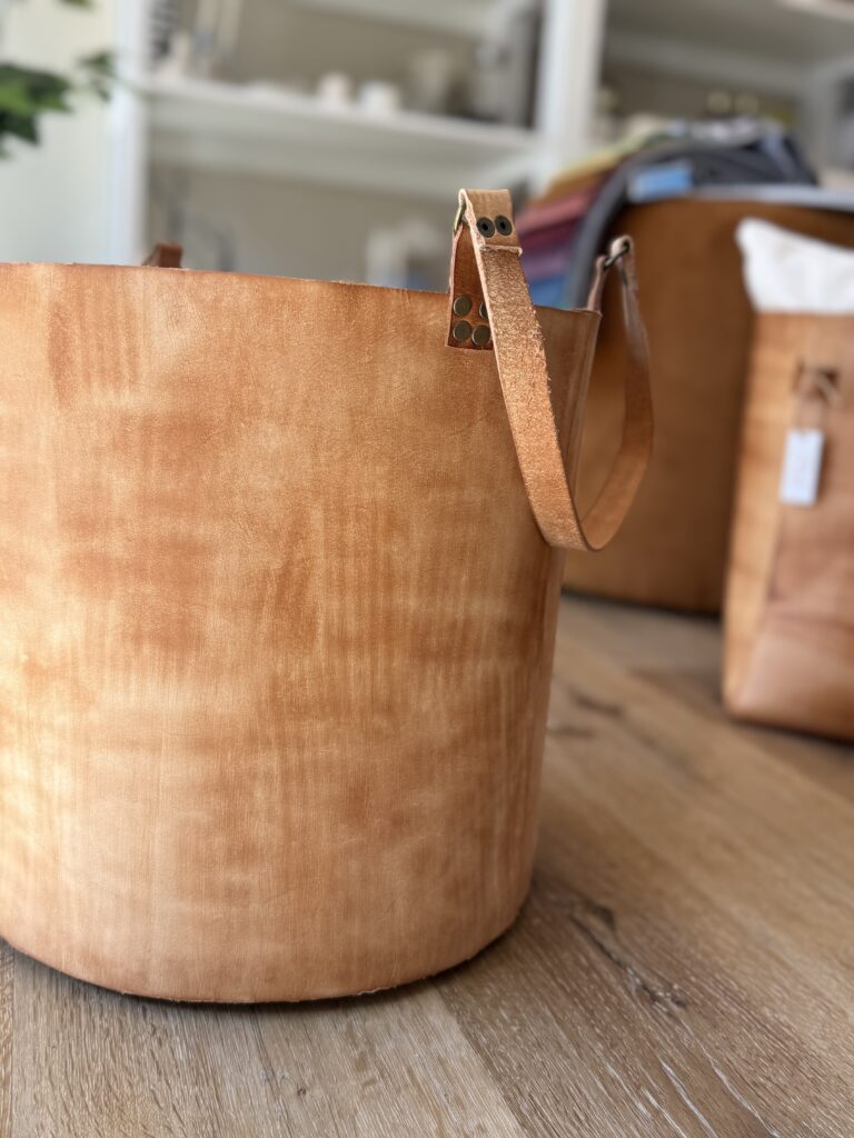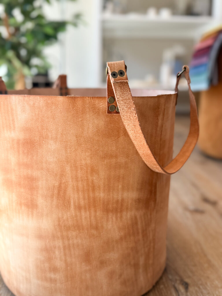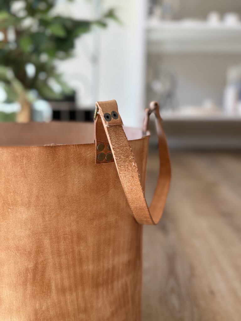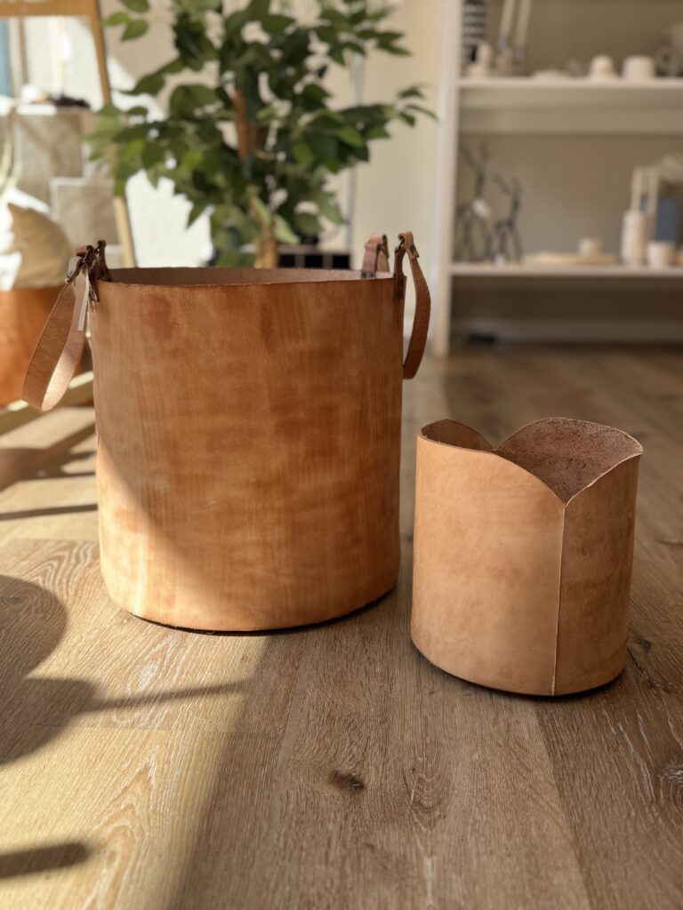 Un nuevo cesto se suma a la colección en cuero. Cesto con asas (de 30 cm) es una pieza ideal para contener mantas, juguetes en el estar, piñas o textiles en el recibidor, o una maceta grande en ese rincón que pide algo más.