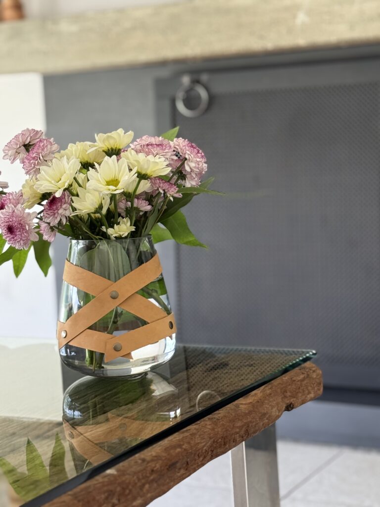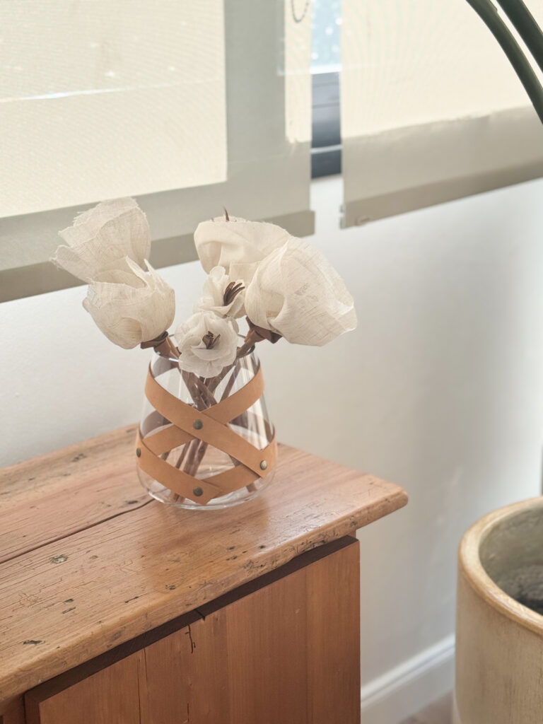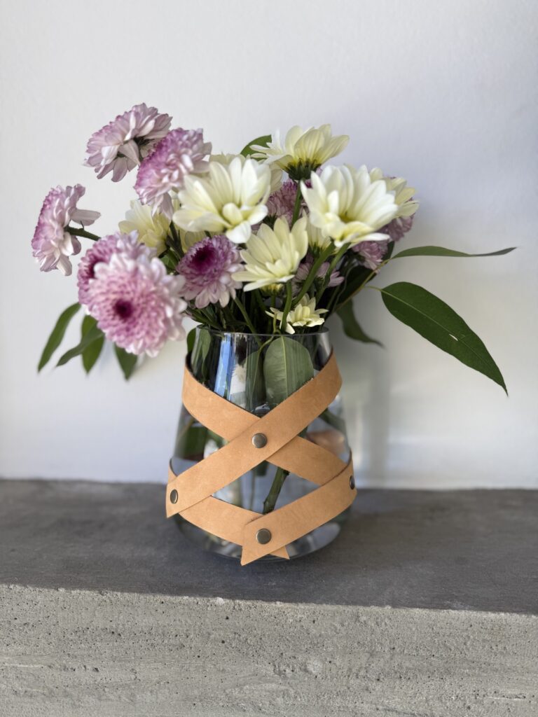 Queda perfecto en una mesa baja, una estantería o como centro de mesa, tanto con flores secas como con ramas verdes. La faja de cuero puede quitarse y usarse también en otros recipientes, lo que lo vuelve aún más versátil.