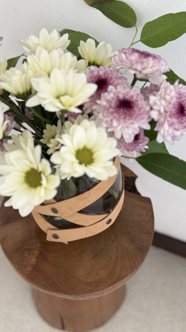 Este florero de vidrio con diseño ancho y líneas curvas se vuelve protagonista gracias a la doble tira de cuero desmontable, cruzada con remaches metálicos. Un detalle artesanal que realza la nobleza del vidrio y suma carácter a cualquier composición.