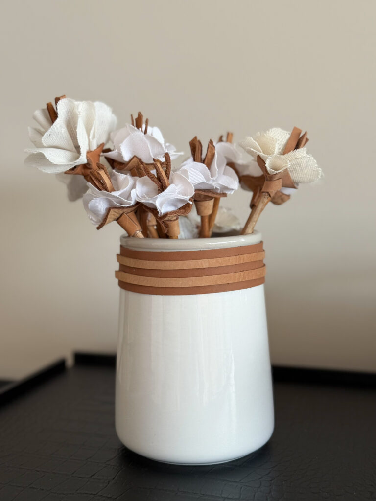 Este florero fusiona la transparencia del vidrio con la calidez del cuero, creando un equilibrio entre lo natural y lo sofisticado.