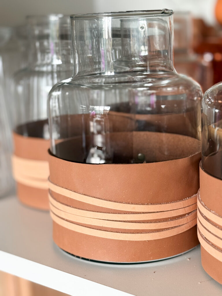 Materiales: vidrio transparente y cuero natural.