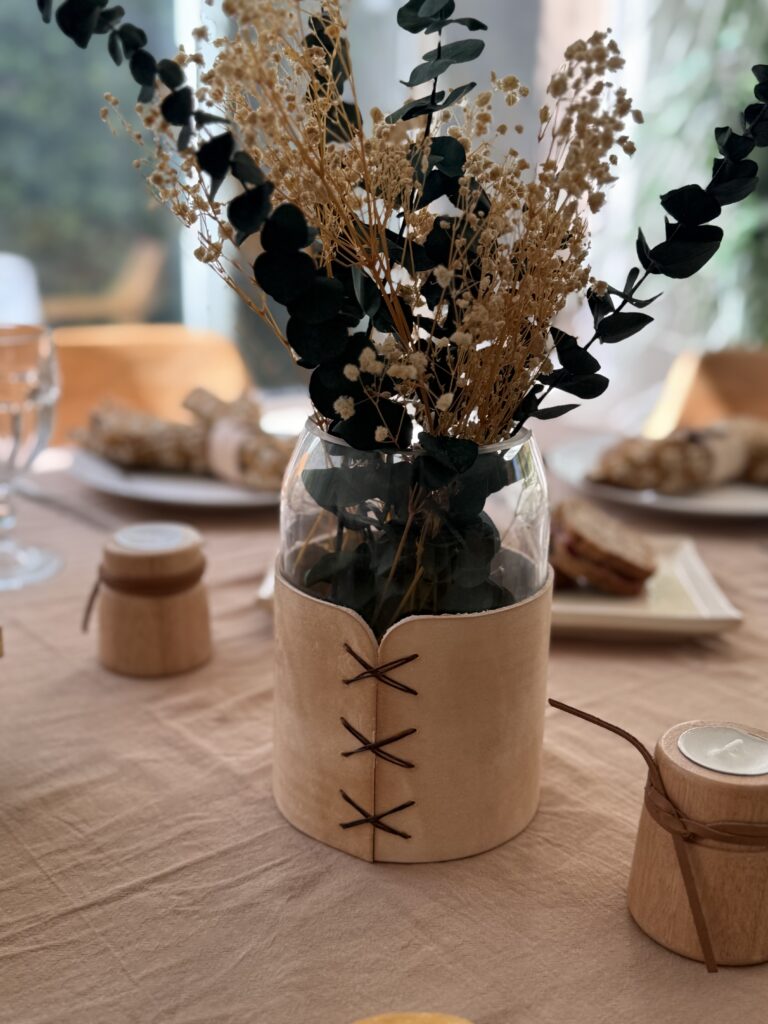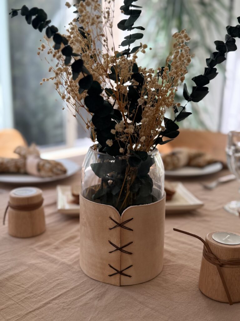 Este florero está realizado con baqueta natural patinada, desmontable que aporta un gesto visual distintivo y con impronta. Es ideal para sumar flores frescas, ramas secas o simplemente decorar una mesa, una repisa o un rincón especial.