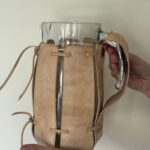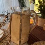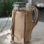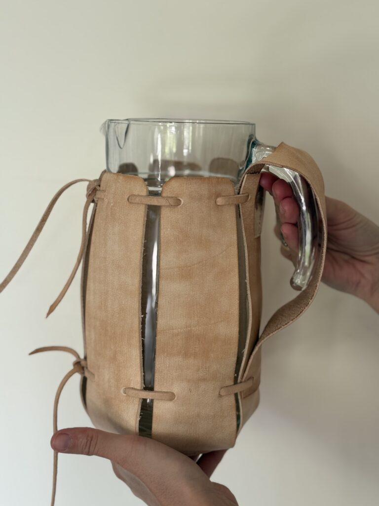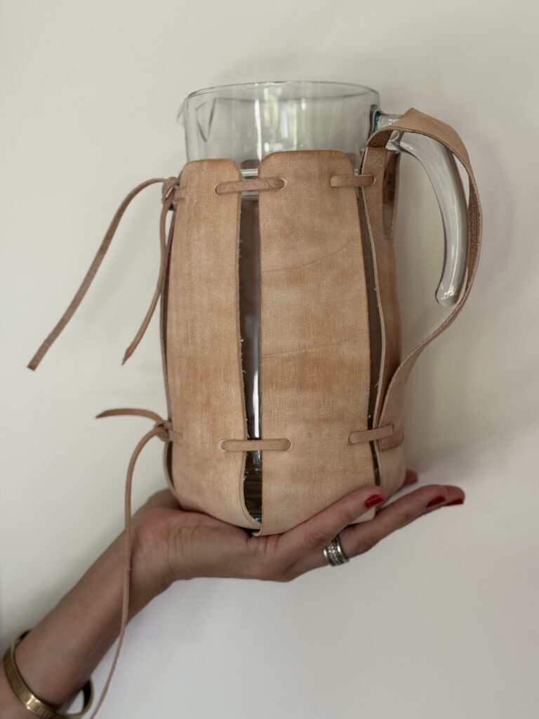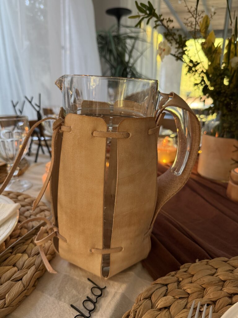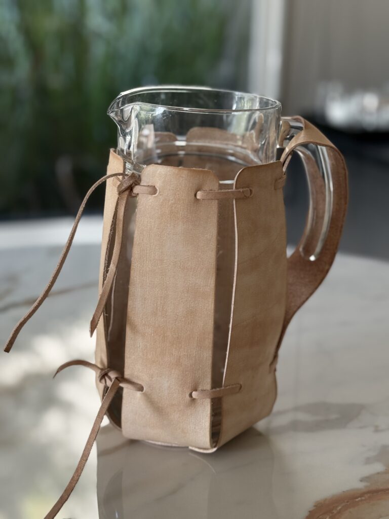 La Linda es una jarra de vidrio con una funda artesanal en cuero natural, cosida a mano y completamente desmontable para facilitar su limpieza. El cuero aporta calidez visual, mientras que el vidrio transparente resalta el contenido y acompaña tanto mesas cotidianas como celebraciones especiales.