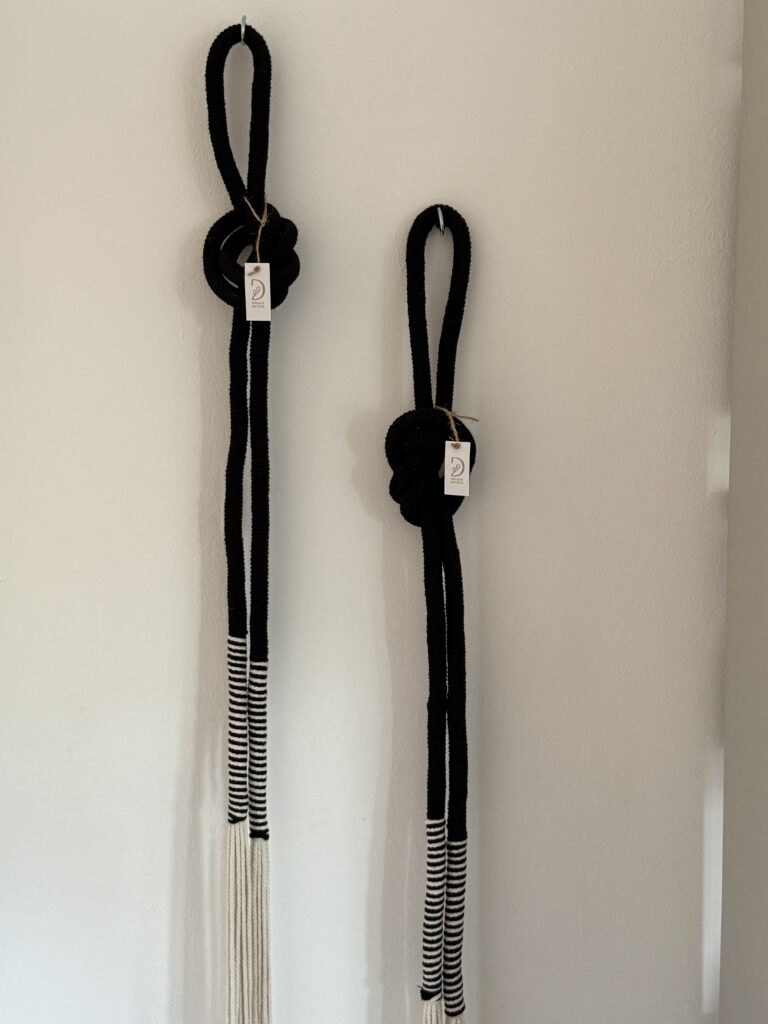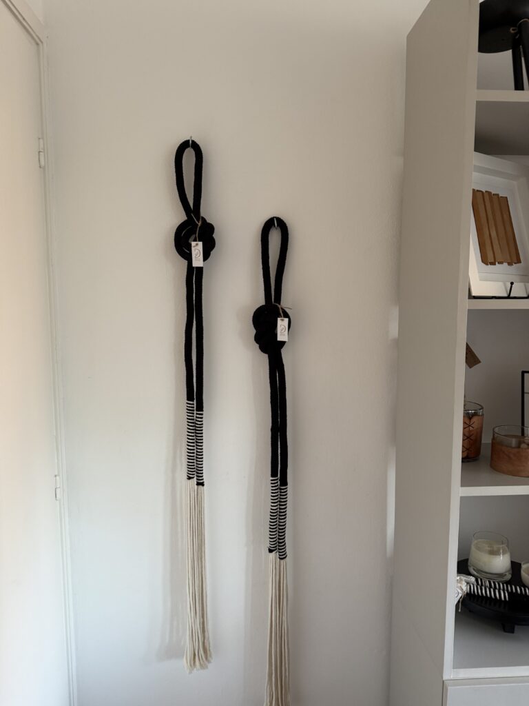 Una composición pensada para sumar textura, movimiento y carácter a cualquier ambiente. Este kit incluye dos nudos náuticos grandes, hechos a mano con hilo macramé, en los tonos negro y una franja blanco y negro. Cada pieza se cuelga fácilmente en pared y aporta un toque decorativo con impronta natural y artesanal.