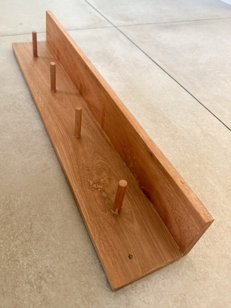 Las perchas pueden ir rectas o inclinadas según preferencia, y la repisa superior funciona como apoyo decorativo o funcional.