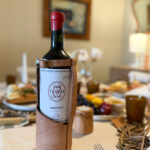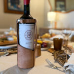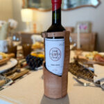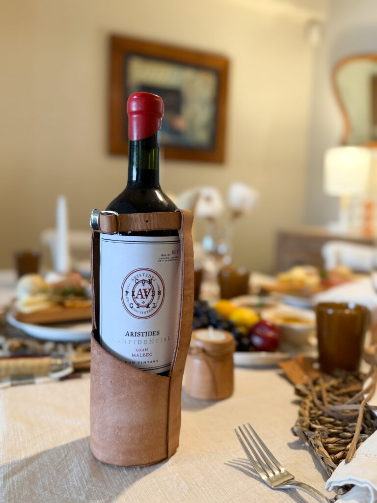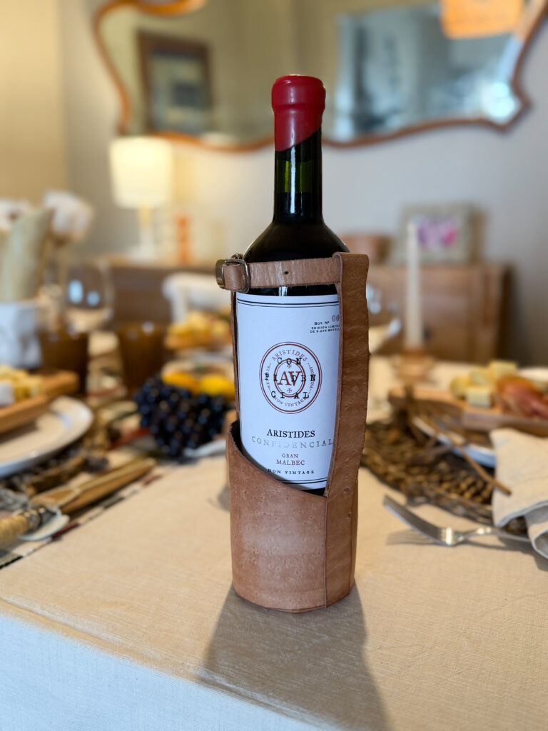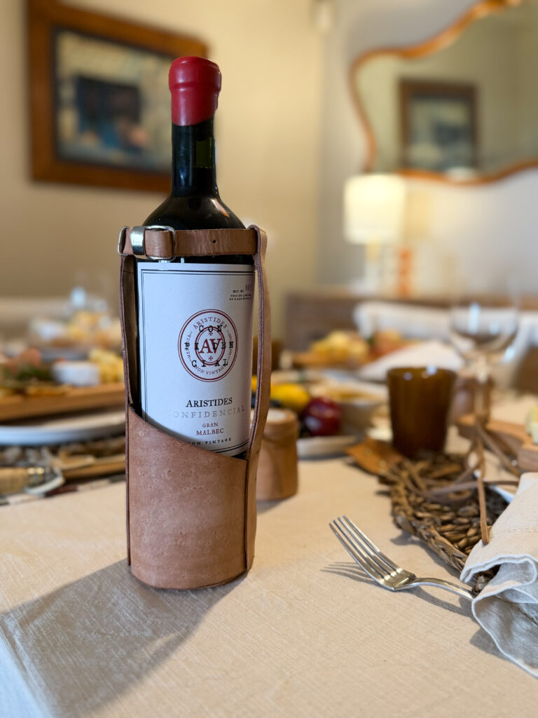 Este porta vino artesanal está hecho con cuero natural y una hebilla que asegura la botella con firmeza y estilo.