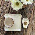 El vaso tiene el tamaño justo para café con leche, jugo o infusiones. El plato rectangular y el apoya cucharita están pensados para que todo tenga su lugar. Y la cucharita de acero inoxidable (dorada o plateada, según stock) le suma un detalle funcional y decorativo.