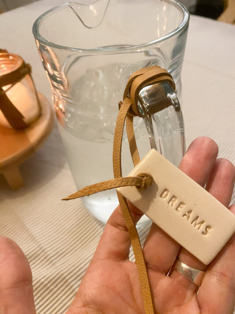 Cada palabra evoca algo distinto —limonada, amigos, menta, celebra— y cada pieza está hecha a mano, con esmaltes no tóxicos y lazo de cuero natural.